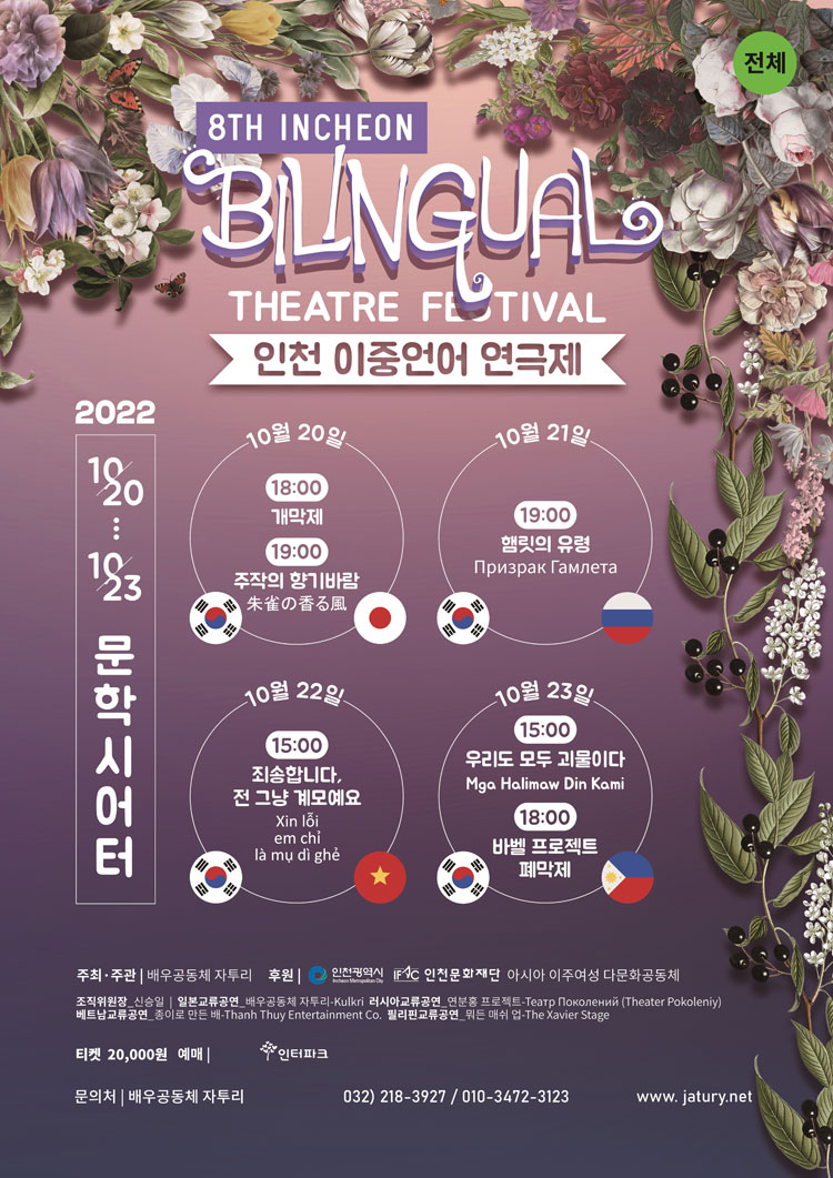 ●10월 20일 개막식 19시 ~ 19시 30분 / 일본 협력공연 19시 30분 ~ 21시 30분 (주작의 향기바람 - 朱雀の香る風) ● 10월 22일 베트남 협력공연 15시 ~ 18시 (죄송합니다. 전 그냥 아줌마예요 - XIN LỖI EM CHỈ LÀ MỤ DÌ GH-) ● 10월 23일 러시아 협력공연 15시 ~ 18시 (햄릿 – Hamlet) 다중언어 이벤트 바벨프로젝트 및 폐막식 19시 ~ 21시