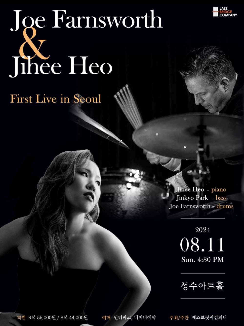 스윙감 넘치는 정통 재즈 드러머, 조 판스워스의 첫 내한공연! 현재 뉴욕 재즈씬에서 왕성하게 활동 중이며 최고의 사이드맨이자 드러머로 칭송받는 드러머 조 판스워스와 미국과 한국을 오가며 활동중인 피아니스트 허지희, 그리고 국내 재즈씬에서 전통 재즈의 명맥을 이어가고 있는 베이시스트 박진교가 함께 만나 한국 관객을 위한 특별한 트리오를 구성했다. 뉴욕의 루디 반 겔더 스튜디오에서 녹음한 정규 2집 를 최근에 발매한 피아니스트 허지희는 뉴욕 최고의 스트레이트 어헤드 계열의 연주자들과 함께 스윙감 넘치는 정통 미국 재즈 사운드를 담아 내었고, 그녀의 이번 음반 녹음은 물론 다양한 공연에서 꾸준히 함께 호흡을 맞추고 있는 조 판스워스와 그의 첫 내한공연을 펼친다. 유려하고 매끄러운 흐름의 피아노 멜로디와 정교하고 이지적인 베이스 라인, 그리고 제대로 스윙하는 동시에 안정적이고 세련된 드러밍을 제대로 느껴볼 수 있는 이번 피아노 트리오 공연은 Smoke, Zinc Bar 같은 뉴욕의 정통 재즈 클럽에서 들을 수 있는 보다 흥겹고 즐거운 재즈를 국내에서 만끽하는 특별한 기회가 될 것이다. “판스워스의 드러머로서의 역량은 거의 완벽에 가깝다. 그리고 이런 재능이 있는 경우엔 자신의 능력이 어느 한 분야의 표현으로 밀려나지 않는다” – 베니 골슨 1968년생인 조 판스원스는, 현재 재즈계에서 가장 존경을 받고 있는 드러머중에 한명으로, 맥코이 타이너, 해롤드 메이번, 베리 해리스, 세달 월튼, 다이애나 크롤, 조지 콜맨, 베니 그린, 호레이스 실버, 브레드 멜다우 등과 연주한 재즈계의 역사와 함께하는 드러머이다. 뉴욕에서 빌리지 뱅가드, 스몰스, 스모크, 디지스 등에서 활발히 활동 중이며, 100개가 넘는 음반에 참여하며 사이드 맨으로 왕성한 활동을 펼치고 있다. 국내 팬들에게는 에멧 코헨의 라이브 공연에서 많은 명 연주들을 남겼으며, 명실공히 뉴욕을 대표하는 드러머 중에서 전통 재즈의 스타일을 계승하는 연주자로 또한 그의 이름으로 전세계적으로 투어 활동과 페스티벌 초청 공연을 진행하고 있다. “허지희는 라이징 스타이며 위대한 밴드 리더이다” – 조 판스워스 “피아니스트 허지희는 탄탄한 서정성과 화려한 하모니를 기반으로 만드는 아름다운 레가토 터치를 가지고 있으며 그녀의 작품은 섬세하고 세밀한 형체들로 채워져있다” – 다운비트 허지희는 현재 뉴욕 현지에서 활발하게 활동하고 있는 떠오르는 신예중 한명으로 주목받고 있는 한국인 여성 피아니스트로, 드러머 조 판스워스, 빈센트 헤링, 로니 플락시코 등의 거장들과 함께 앨범 작업 및 공연활동을 하고 있는 중이다. 미국의 유명 잡지 다운비트, 올어바웃 재즈 등에서 좋은 평점으로 평가받았으며, 프랑스와 미국의 여러 재즈 라디오 스테이션에서 그녀와 인터뷰 진행및 다양한 평론들로 그녀의 음악을 다루었다. 현재 뉴욕 현지를 중심으로 스몰스, 메즈로, 징크스, 장고등에서 활발히 활동중이며, 드러머 조 판스워스, 베이시스트 알렉산더 클래피, 색소포니스트 빈센트 헤링과 녹음한 2집 트리오 앨범 가 2024년 6월21일 발매되었다.