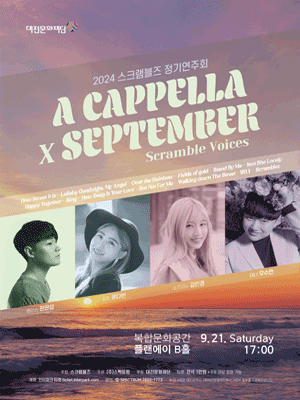 오로지 목소리만으로 연주하는 전통 아카펠라 그룹 스크램블즈가 오는 09월 21일 토요일 오후 5시, 복합문화공간 플랜에이 B홀에서 "A CAPPELLA X SEPTEMBER" 콘서트를 개최하고자 한다. 스크램블즈는 목소리를 섞은 아카펠라 음악으로, 부담스럽지 않은 달걀처럼 친숙하게 다가가고 싶다는 염원을 담은 뜻을 지닌 단체이다. 그동안의 수많은 연주회를 통해 청중에게 친숙하게 다가갈 수 있는 프로그램으로 매번 색다른 무대를 올리며 발전해 나아가고 있다. "A CAPPELLA X SEPTEMBER"를 부제로 개최되는 이번 공연은 9월 가을을 주제로 스크램블즈만의 특색있는 표현력과 다채로운 아카펠라 음악세계를 대전시민들과 음악애호가들에게 선보일 예정이다. 2024 스크램블즈 정기연주회 "A CAPPELLA X SEPTEMBER" Scramble Voices OPENING How Sweet It Is (작곡 Edward Holland, 편곡 Kirby Shaw) Lullaby_Goodnight, My Angel (작곡 Billy Joel, 편곡 Ross Beigbie & Naomi Crellin) Over the Rainbow (작곡 Harold Arlen, 편곡 스크램블즈) Fields of Gold (작곡 Sting, 편곡 Idea of North) Stand By Me (작곡 Ben E. King, 편곡 Roger Emerson) Isn't She Lovely (작곡 Stevie Wonder, 편곡 Idea of North) Happy Together (작곡 The Turtles, 편곡 Audrey Snyder) Sing (작곡 Joe Raposo, 편곡 스크램블즈) How Deep Is Your Love (작곡 Bee Gees, 편곡 Gerard John B Dela Pena) But Not For Me (작곡 George Gershwin, 편곡 Idea of North) Walking down The Street (작/편곡 The real group) 바다 (작곡 장용진, 편곡 스크램블즈) Scramblez (작/편곡 스크램블즈)