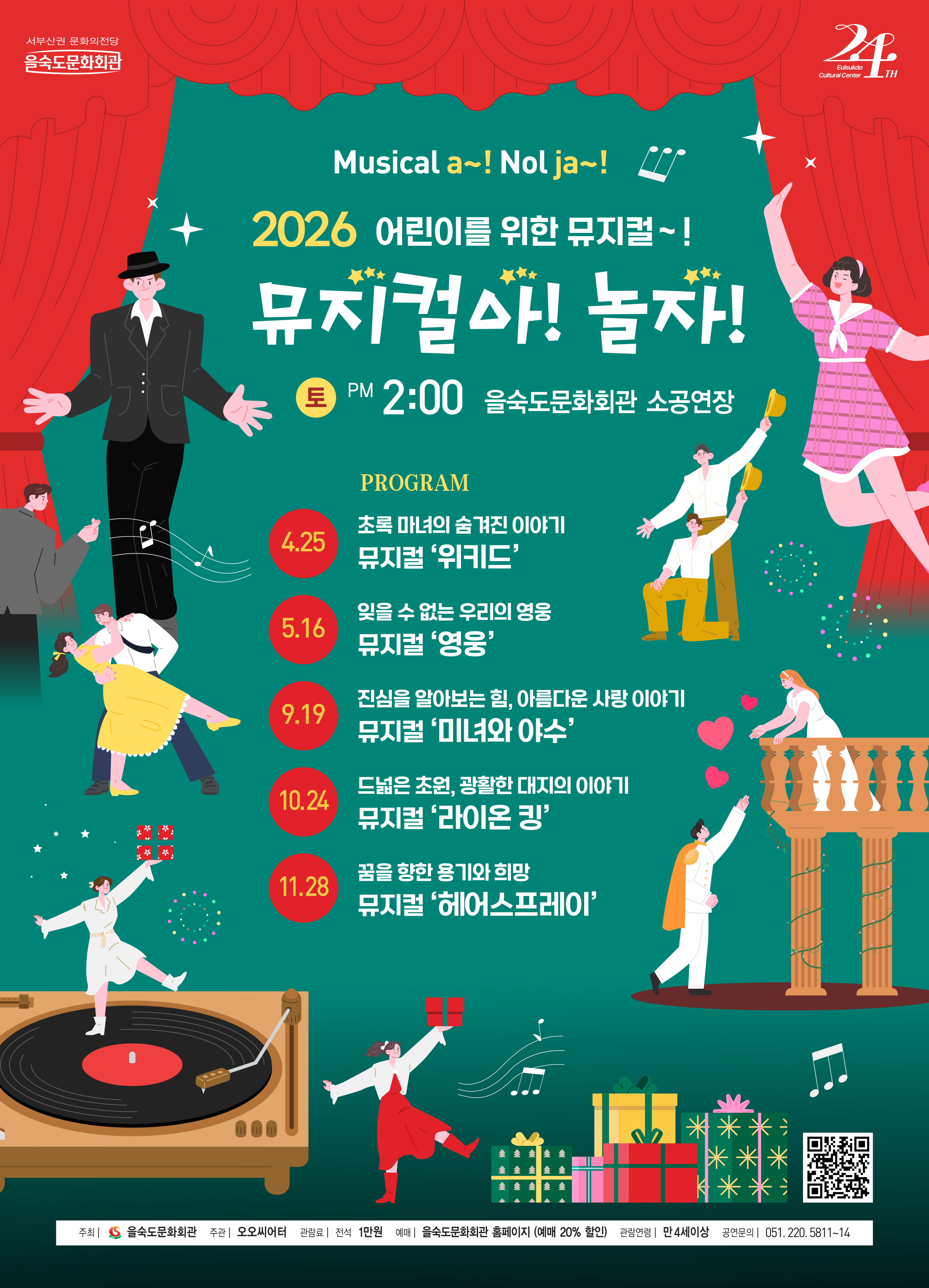 어린이 눈높이에 맞춘 ‘뮤지컬아 놀자’ 공연이 2026년 5회 시리즈 공연으로 진행된다. 4세 이상이면 가족들과 함께 관람할 수 있는 뮤지컬 갈라쇼로 가족과 함께 보낼 수 있는 주말 추천 프로그램이다. 신나는 음악과 춤, 함께 이야기 나눌 수 있는 스토리를 담은 공연으로 매 공연마다 달라지는 이야기와 뮤지컬 넘버로 늘 찾아도 지루하지 않는 시리즈물이다. 뮤지컬에 대한 흥미와 재미를 느끼고 아이들의 동심의 세계를 더욱 풍성하게 만들어 주는 공연이 될 것이다.