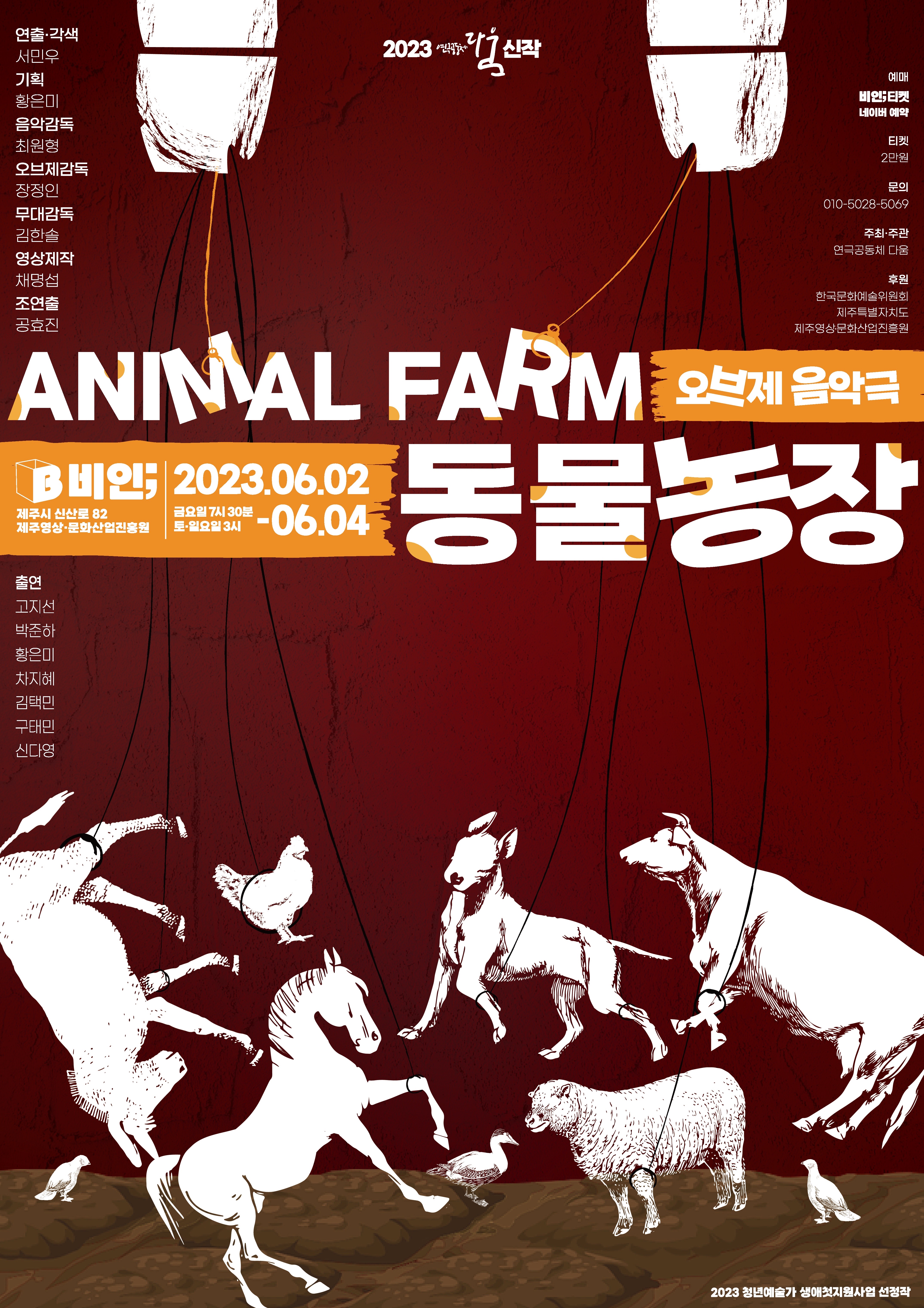 오브제음악극 “인간을 몰아내고 동물들에 의해 운영되는 동물농장이 독재자 돼지에 의해 지배되는 이야기” 조지오웰의 원작 소설 이 연극공동체 다움의 오브제 음악극으로 재탄생한다. 광대들의 신나는 움직임과 흥겨운 음악에 다양한 오브제를 통해 무대 위에서 살아 움직이는 동물로 변하며 관객의 상상력을 자극한다. 소설 속에서 동물들은 인간을 쫓아내고 자기 스스로 운영하는 “동물농장”을 만든다. 하지만 이들의 농장은 인간들에 의해 억압당했던 것처럼 일부 돼지들에 의해 착취당한다. 아무 생각 없이 노동만 해서는 자신의 존엄성을 지킬 수가 없다. 우화는 인간의 모습을 닮아있다. 어느 사회에나 권력을 가진 자들은 여러 가지 방법을 동원해서 피지배계층을 착취하려고 하는 것이다. 이 작품을 통해 어떻게 우리가 권력자로부터 당하지 않고 스스로의 존엄성을 지키며 깨어있을 것인가 생각해 보고자 한다.