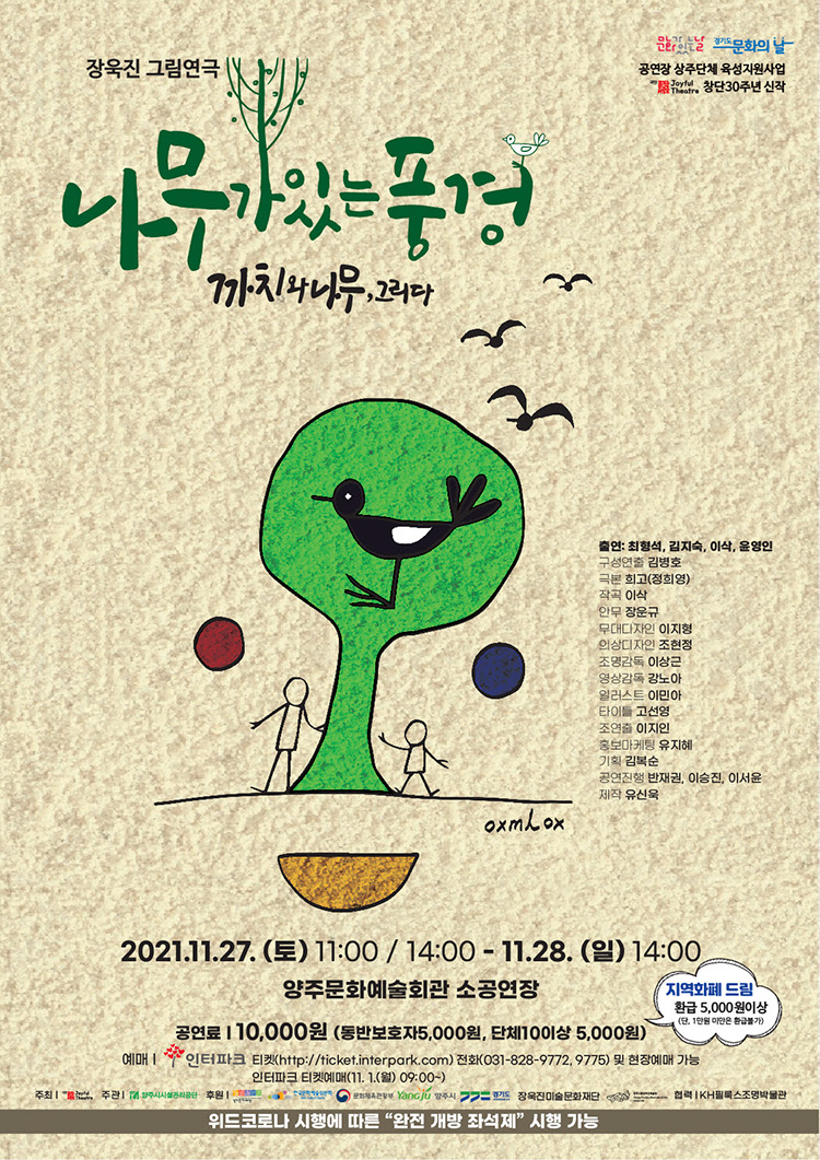 3代가 함께 공감하고 남녀노소가 즐겁게 관람하는 그림연극, 음악극 마음의 눈으로 바라보는 시선, 동심과 놀이성을 가진 일상, 우리에겐 동심이 필요하다. 나를 들여다보는 힘으로 가끔은 동심으로 돌아가 어린아이의 마음을 가져보면 좋겠다. 장욱진 화가의 그림 속 아이, 까치, 달, 나무가 있는 풍경을 따라 동심 속으로... ‘나는 심플하다.’ 는 말이 아이들의 동심과 맞닿아 있듯 세상을 살아가는 아이와 어른이 서로를 통해 바뀌어 가는 시각을 가질 수 있기를 희망하는 음악극 ‘나무가 있는 풍경’ 을 그려 본다. 까치 그림을 잘 그리고 싶었던 동이는 한 할아버지와 만나게 되고, 그가 화가란 사실을 알게 된다. 화가를 따라 전기도 들어오지 않는, 자연 한복판에 놓인 그의 집까지 가게된다. 그림을 제대로 배울 수 있을 거라 기대했던 동이에게 화가는 엉뚱한 말만 늘어놓고, 참된 자기 것을 그리라는 화가의 말에 동이는 어리둥절해 하며 잠이 든다. 잠이 든 동이를 두고, 새벽 산책을 나간 화가. 잠이 깬 동이는 화가가 그려놓은 세상 속에서 작작이와 수목이를 만나 한데 어울려 놀게 된다. 마음의 눈으로 나누는 그림 속이야기가 궁금해 진다.