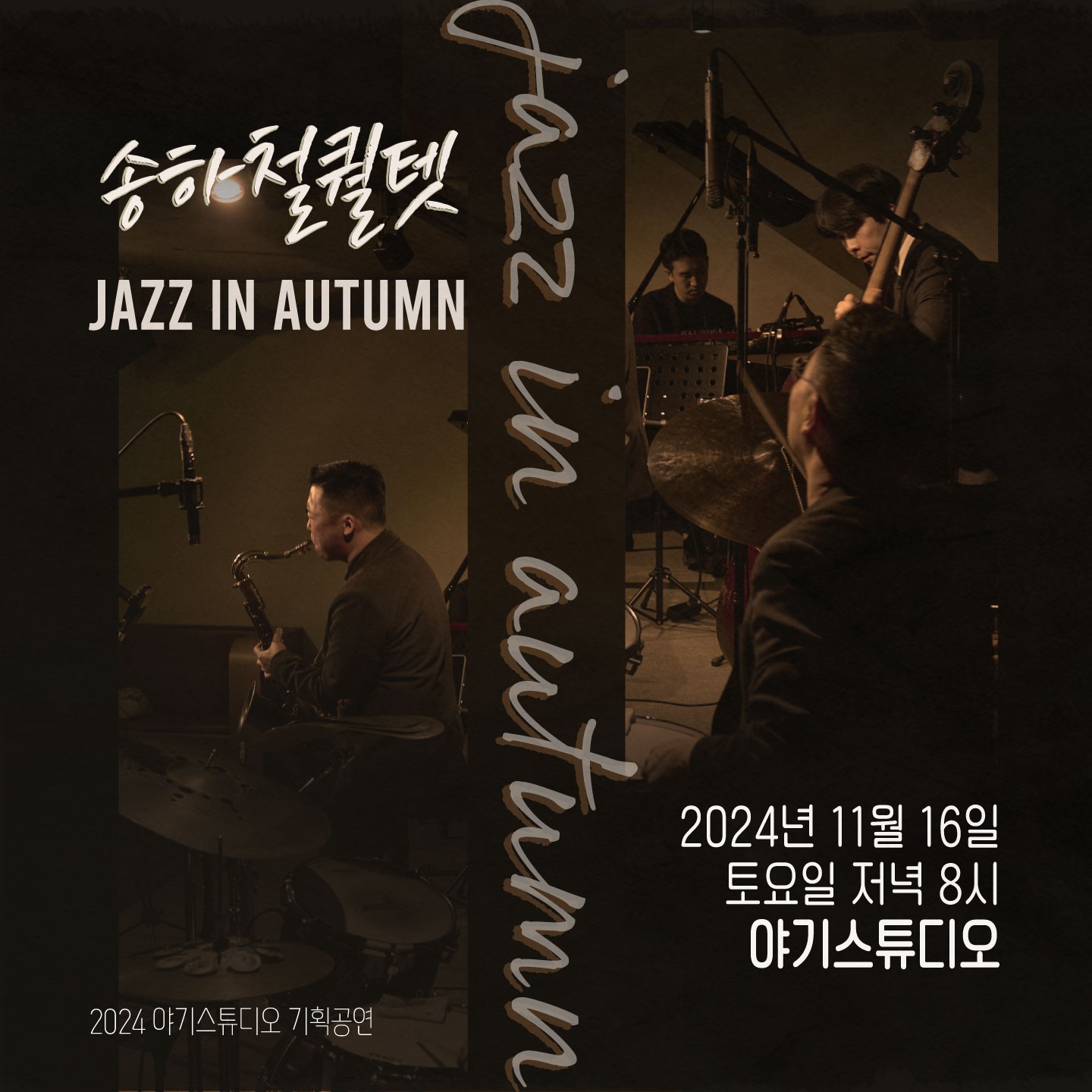재즈 뿐만 아니라 국악, 가요, 팝 등 다양한 장르에서 왕성한 활동을 하고 있는 색소포니스트 송하철 정규 3집을 앞둔 송하철 퀄텟과 함께하는 가을밤의 재즈 와인과 함께 재즈의 매력에 빠질 수 있는 공연! 11월의 재즈공연, 송하철 퀄텟!! 우리나라에서 핫한 재즈 색소폰 연주자 송하철! 재즈씬 뿐 아니라 국악, 가요 등 장르 불문 종횡무진하는 그의 리더작으로 연주될 이 공연은, 가을과 어울리는 발라드곡 뿐 아니라 색소폰의 매력을 마음껏 느낄 수 있는 곡을 연주할 예정입니다. 이번 공연은 특별히 '와인'과 함께 하는 공연인데요! 재즈 연주만 듣기 아쉬웠던 분들을 위해 특별히 준비하였습니다. 11월의 가을 밤. 빼놓을 수 없는 재즈 그리고 와인! 완벽한 하루의 마무리를 송하철퀄텟과 함께 하세요