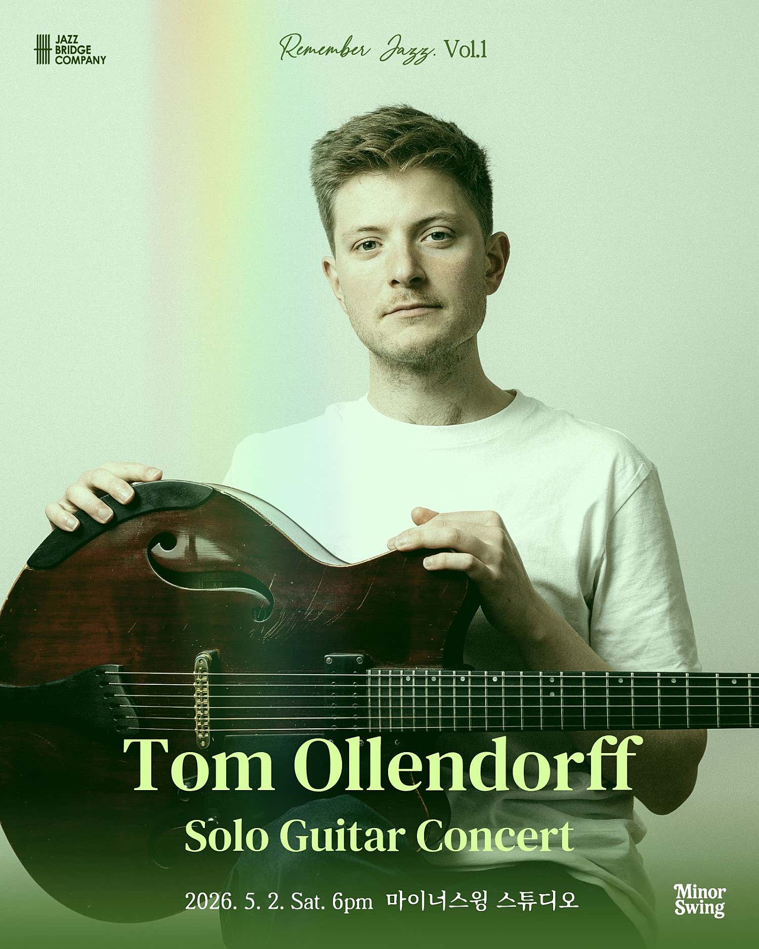 리멤버 재즈 Vol.1 Remember Jazz Vol.1 리멤버 재즈 시리즈의 첫 시작은 톰 올렌도프 솔로 기타 콘서트 입니다. 사실 이분의 솔로를 듣고 싶어서 이 시리즈를 런칭하게 되었다고 해도 과언이 아닐만큼, 오롯이 기타 한대로 접해보는 그의 음악과 그가 그려내는 재즈의 세상안에는 참 다양하면서도 따듯하고, 순수하고, 사려깊은, 그런 풍경들과 시선이 느껴집니다. 그가 만약 영화 감독이라면, 한편의 예술영화를 보는 느낌이 들고 자연스럽게 그가 이야기하는 캐릭터와 풍경에 빠져들게 하는 매력이 있습니다. 결국 그의 음악은, 그저 좋은 테크닉과 아름다운 톤 이상으로 그만의 "이야기" 가 느껴지는듯 합니다. 영국에서온, 따듯하고 부드러운 성품의 세련되고 현대적인 감성의 스토리텔러, 톰 올렌도프의 음악과 함께 당신의 5월을 보다 특별히 기억하세요😌