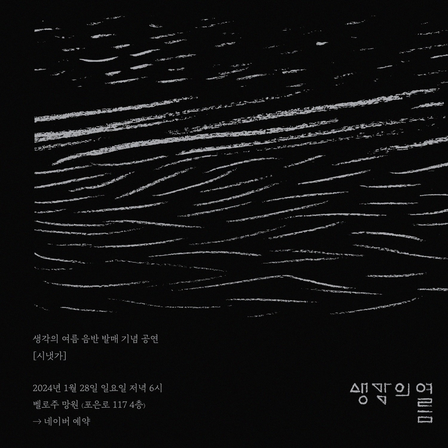 시어의 냇물에서 건져온 노래들 '생각의 여름' 박종현이 내미는 여섯 번째 음악 덩어리이자 두 번째 정규 밖 프로젝트 음반[시냇가]의 발매를 기념하여 만드는 공연입니다. 는 문태준, 신해욱, 유희경, 장석남, 이혜미, 민구, 황인찬, 김복희 시인이 2000년대 이후 기발표한 작품의 전문 혹은 일부를 가사로 하여, 그로부터 느껴진 청각 언어적 리듬과 질감을 꺼내 음악으로 빚은 시도의 묶음입니다. 우리 시대의 시인들이 빚은 '지금, 여기'의 언어들을 눈 앞에서 귀 곁으로 조심스레 옮겨본 이번 작품은 디지털 음원(2024년 1월 12일)과 CD 음반(24일)으로 발매됩니다. 본 공연에서는 [시냇가]의 수록곡들뿐 아니라 데뷔 옴니버스 음반 [관악청년포크협의회](2005)에서부터 첫 독집 [생각의 여름](2009)과 [곶](2012), [다시 숲 속으로](2016), [The Republic of Trees](2019)와 [손](2022)에 이르기까지 그간 짓고 불러온 음악들을 관객 여러분과 차근차근, 사뿐사뿐 나눌 예정입니다.