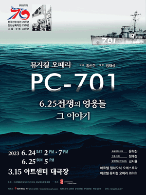 뮤지컬 오페라 PC-701 6.25전쟁의 영웅들 그 이야기 전4막 〈1막1장〉 “절망 중 울려 퍼지는 걸레의 노래” 〈1막2장〉 “영웅의 고뇌와 소망” 〈2막1장〉 “해군창설” 〈2막2장〉 “충무공의 후예들” 〈3막1장〉 “사랑의 노래 ? 바다로 가자” 〈3막2장〉 "인천상륙작전"