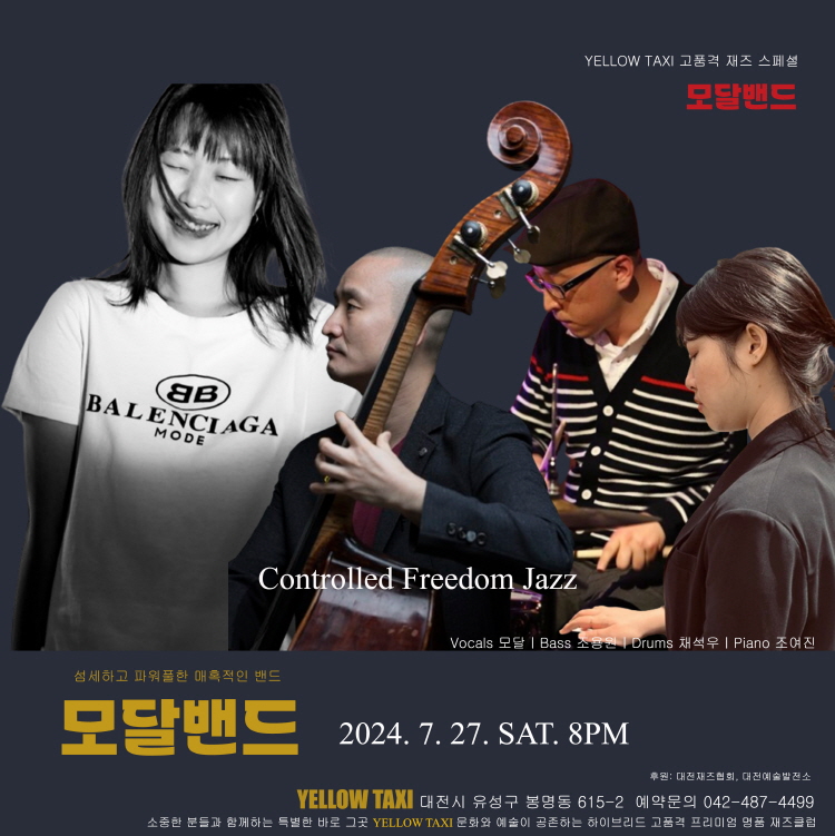 파워풀 에너제틱 재즈! Controlled Freedom Jazz! 모달밴드 대전공연! 한국 재즈신에서 왕성한 활동을 하고있는 재즈보컬리스트 모달을 주축으로 Cotrolled of Freedom 의 가치관을 지향하여, 파워풀 하고 에너지 넘치는 연주, 그리고 디테일한 개성을 살려 더욱 독특한 재즈 음악을 연주하고 뮤지션은 물론 관객들과도 재미있는 소통을 하는 밴드입니다. 이번 대전명소 재즈클럽 YELLOW TAXI 공연에는 베이스 조용원, 드러머 채석우, 피아니스트 조여진등 한국을 대표하는 최고의 연주자 분들과 함께 오리지날 곡, 많은 분들이 좋아하는 스탠다드 명곡들을 연주해서 더욱 감동적이고 매혹적인 무대를 선사할 것입니다. 음악을 사랑하시는 분들의 많은 관심 바랍니다.