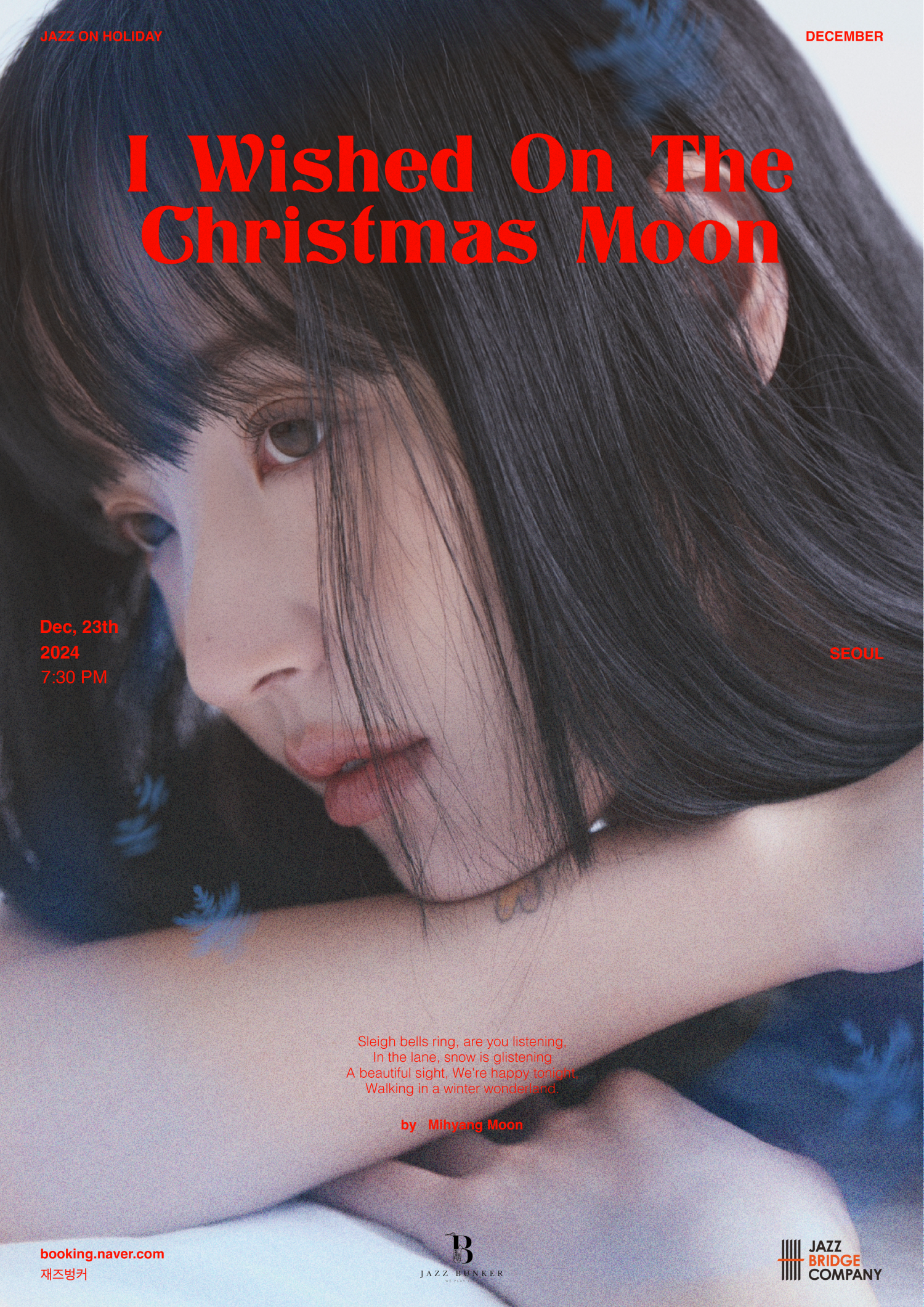 문미향 크리스마스 콘서트 - 서울 'I Wished On The Christmas Moon' 올해 한국대중음악상 '최우수 재즈보컬 음반' 후보에 올랐던 문미향의 정규 1집 음반의 수록곡을 기반으로 새롭게 편곡한 크리스마스 레퍼토리를 선보이게될 이번 'I Wished On The Christmas Moon' 공연은 감미롭고 듣기 편안한 정통 재즈와 스윙, 뮤지컬 넘버와 캐롤을 소개할 예정입니다. 남녀노소 누구나 즐겁게 관람할 수 있는 이번 공연은 20세기 초중반에 유행했던 정통 재즈, 즉 '재즈 스탠더드'로 평가받는 보다 고전적이고 전통의 미학이 살아있는 고풍스럽고 현대적인 감각의 연주로, 중장년 층에게는 지난날의 향수를 불러일으키며, 젊은 층에게는 레트로의 감성과 낭만을 제공하며 관객들에게 은은한 여운을 남길 것입니다. 또한, 이번 공연은 재즈 애호가들과 재즈 아티스트의 사랑을 받는 프라이빗 아지트이자 복합 문화 공간인 재즈 벙커에서 진행되는 소규모 파티 같은 공연으로 관객들에게는 음료 한잔이 제공됩니다. 크리스마스 콘서트에서만 들어 볼 수 있는 특별한 레퍼토리를 스윙, 발라드, 보사노바 등 풍성한 스타일의 재즈연주와 문미향의 독보적인 음색으로 들어볼 수 있으며 보다 가까운 거리에서 따듯함과 친근함이 함께 느껴지는 문미향 콰르텟의 연주를 통해 아늑하고, 편안하고, 부드러운 '문미향 사운드'의 진수를 체험해 보실 수 있을 것입니다. 좋은 사람들과 좋은 재즈가 함께하는, 특별한 프라이빗 공간 재즈벙커. 이곳에서 보다 특별한 낭만과 즐거움이 있는 크리스마스 선물 같은 이번 공연은 재즈 팬들은 물론 보다 특별한 추억을 만들고 싶은 일반 관객 누구나 함께 즐길 수 있는 대중 친화적인 재즈 프로그램을 소개할 것입니다.