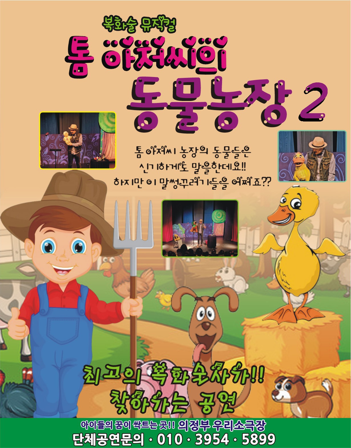 복화술사 박용우 선생님에게 듣는 콘서트형식의 특별한 복화술뮤지컬. 톰아저씨 동물농장에 말을 할 줄아는 말썽 꾸러기 동물들이 왔어요. 오리, 멍멍이, 꿀꿀이... 이들의 좌충우돌 재미난 이야기, 환상적인 복화술로 잼나게 즐겨보는 시간