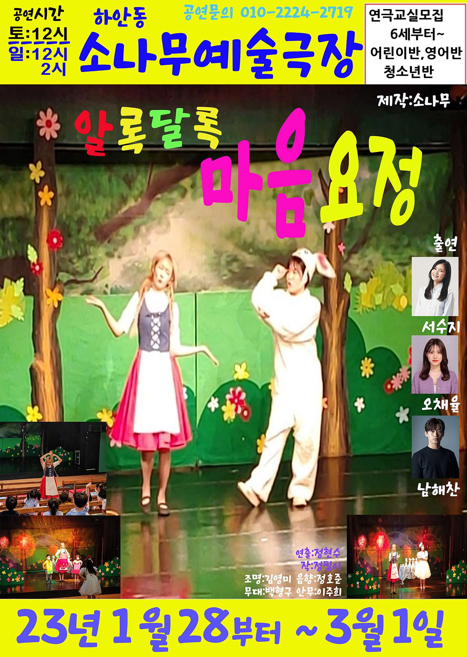 마음은 어떤 모양알까요? 마음은 어떤 색 일까요? 마음은 어떻게 표현해야 할까요? 우리는 마음을 표현하는데 부끄러워하기도 하고 어려워합니다. 또한 우리는 일방적인 마음표현으로 다른 사람의 마음을 아프게도 하지요. 알록달록 마음요정 은 마음을 찾기 위해 문제를 관객과 함께 같이 풀어가는 관객 참여 공연입니다. 마음의 중요성과 주변사람들에게 마음을 전하는 방법을 생각하는 창작 교육연극입니다.