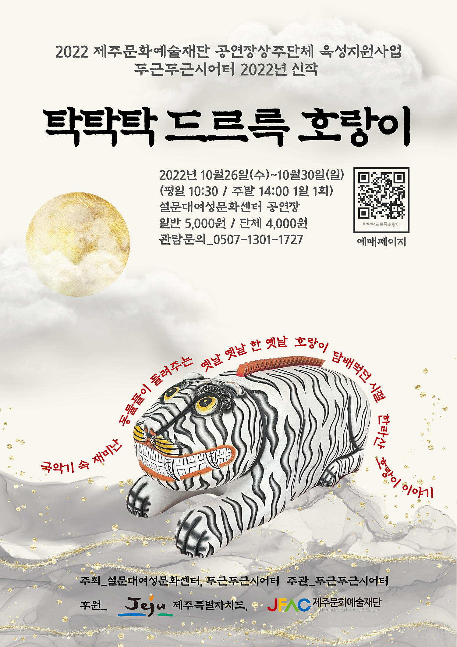 우리나라 옛날 이야기 속에는 유난히 호랑이가 많이 등장합니다. 우리 선조들은 호랑이를 두려워하기도 하고 깊이 사랑하기도 했지요. 이야기에도 민화에도 전설과 속담에도, 아! 단군신화까지.... 정말 많은 호랑이가 등장합니다. 우리 고유의 악기들도 예외는 아니어서 호랑이들이 받치고 있는 악기들이 꽤 많답니다. 국악기 속 익살스런 호랑이들이 벌떡 일어나 자기들이 알고 있는 호랑이 이야기를 들려주면 어떨까? 하는 엉뚱한 상상에서부터 이 작품은 시작되었습니다. 우리 호랑이 이야기. 두근두근시어터 특유의 종이인형과 아름다운 국악선율과 멋진 연기가 어우러진 가족극 '탁탁탁 드르륵 호랑이'에 여러분을 초대합니다.