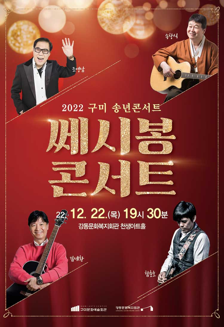 2022년 송년을 맞이하여 구미문화예술회관에서 1970년대 감성인 쎄시봉을 초빙해 팝스밴드 7인조의 라이브 공연으로 생동감 있고 수준 높은 공연을 선사할 예정입니다.