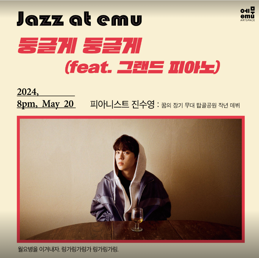 재즈앳에무 - 진수영 공연소개 : 월요병을 이겨내자. 링가링가링가 링가링가링. 피에로를 좋아하는 피아니스트 진수영. 5월의 향기로운 꽃 향기와 따스한 햇살처럼 달콤하고 몽환적인 피아노 선율에 빠져보는 시간을 이번 재즈앳에무에서 준비했습니다. 이번 공연에서는 특별히 준비된 그랜드 피아노가 객석 중앙에 자리를 잡고 무대를 포함해 피아노 주변에 원형으로 객석이 준비 될 예정입니다.