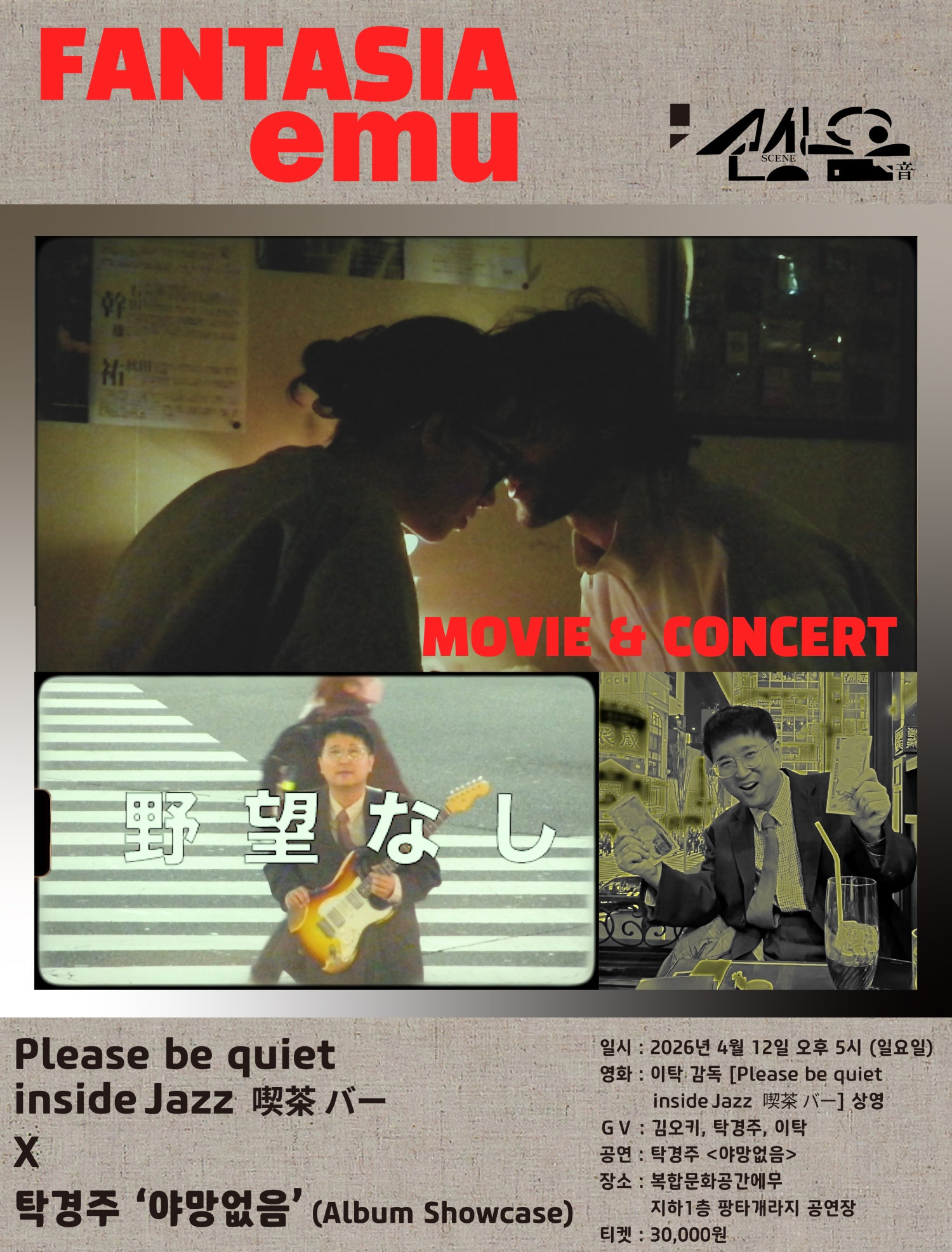 판타지아에무2026 - 씬음 이번 판타지아에무 씬(scene)음(音)은 4월 한달 동안 매주 일요일마다 진행되며, 음악가 김오키가 선정한 영화를 상영하고, 영화 이야기를 나누며 특별한 연주 구성의 단독공연을 관람하는 프로그램입니다. 4월 12일(일) - 씬음 제2화: Please Be Quiet Inside Jazz 喫茶 バー X 탁경주 '야망없음' (Album Showcase) 단편영화 7분 - 이탁 감독 북해도 외곽의 어느 킷사텐 재즈 뮤지션 김오키는 다큐멘터리를 촬영 중이고 킷사에 들어선 연인은 왜인지 눈치만 보는데... MV - 3분 이탁 감독 탁경주 '야망없음' (Album Showcase) 레이블 안다미(ANDAMI)에서 제작한 기타리스트 탁경주의 정규 앨범 [야망 없음]의 쇼케이스.오랜 시간 호흡을 맞춰온 안다미 소속의 연주자들과 함께 탁경주, 김오키, 김일두의 작품을 새롭게 편곡하여 연주한다. - 16:00 1층 카페에무에서 네이버 모바일 티켓 확인 및 입장 팔지 교환 (현장에서 영화 관람 좌석 지정 및 공연장 좌석을 안내해드립니다.) - 17:00 M 에무시네마 1관 또는 2관 상영 (필요시 양관 상영) - 17:10 인터미션 - 1층 카페에무에서 식음료 구매가 가능합니다.(입장 팔지 지참 시 전 메뉴 10% 할인해드립니다.) - 17:20 이탁 감독, 탁경주, 김오키 시네마토크 후 탁경주 '야망없음' (Album Showcase) 공연 - 지하 1층 팡타개라지