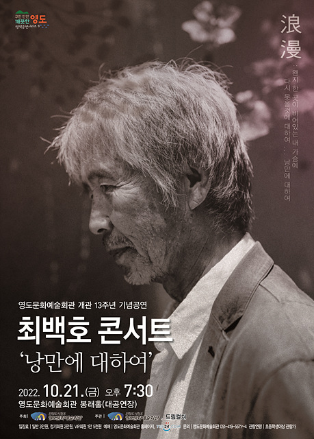 영도문화예술회관 개관 13주년 기념 공연으로 특유의 음색으로 노래하는 음유시인 최백호가 영도를 찾아온다. 노래 인생 45주년을 맞이한 가수 최백호가 인생의 수많은 계단을 지나온 관객들과 함께 호흡하고 추억하는 시간을 마련했다. 때론 딸을 시집보내는 ‘애비’의 마음으로, 때론 입대를 앞둔 ‘청년’의 마음으로, 그리고 때론 중년 남성의 마음으로 ‘낭만에 대하여’ 노래해온 가객 최백호는 함께 나이 들어간다는 것에 집중하며 이전보다 더 깊게 노장의 아우라가 뿜어져 나오는 가슴 벅찬 무대를 선사한다. 2022년 가을, 그의 목소리에서 인생의 파노라마가 펼쳐진다.