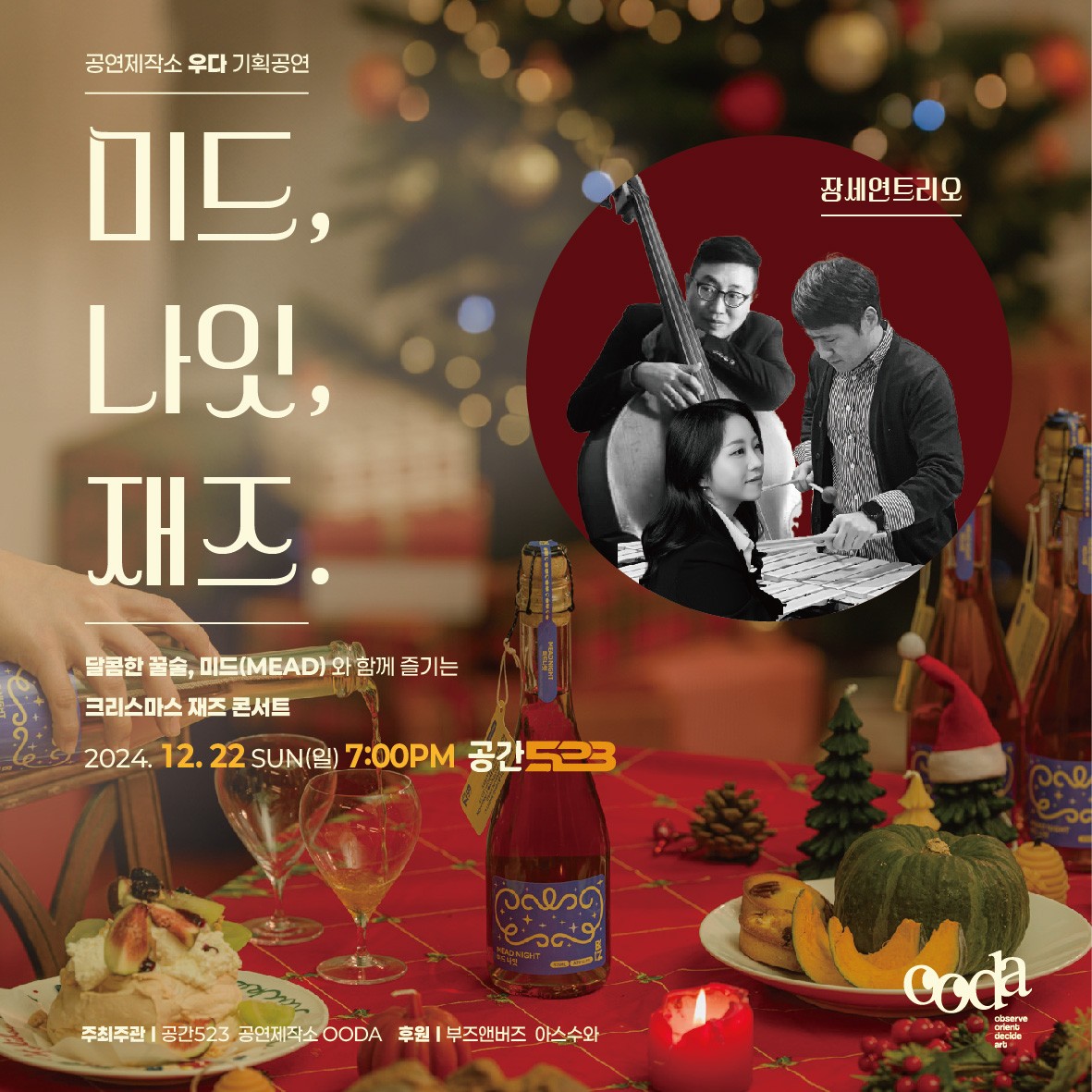달콤한 미드와 크리스마스 재즈가 함께하는 특별한 밤 당신만을 위한 선물 그 어느 해보다 특별하게 기억하고 싶은, 사랑하는 사람과 함께하는 크리스마스! 피아노, 비브라폰, 콘트라베이스가 어우러진 크리스마스 재즈 선율이 울려퍼질 523의 미드, 재즈, 나잇 은은하게 퍼지는 호박과 시나몬의 달콤한 미드 한 잔으로 크리스마스를 즐겨보세요 ! 풍성한 치즈플래터와 함께 준비되어있는 미드, 재즈 나잇! 잔잔한 재즈와 반짝이는 크리스마스 불빛 아래, 연말의 낭만을 채우는 단 하나의 선택, 크리스마스 재즈 콘서트로 당신을 초대합니다 김현철 - 크리스마스에는 축복을 Richard Rodgers - My Favorite Things Meredith Willson - It's Beginning To Look A Lot Like Christmas Astor Piazzolla - Oblivion Richard Rodgers - Happy Talk Antonio Carlos Jobim - No More Blues