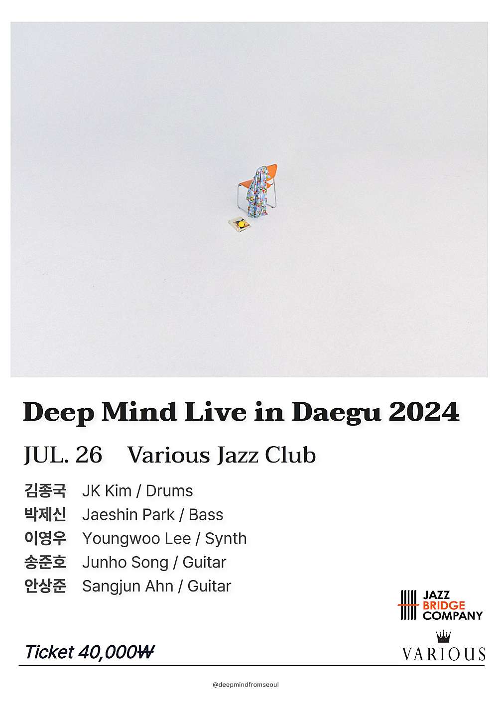 현재 국내에서 가장 신선하고 개성 넘치는 사운드를 지닌 5인의 젊은 뮤지션으로 구성된 Deep Mind는 2021년 발매된 앨범 [Deep Mind] 작업을 위해 결성된 팀이다. 다양한 음악 활동으로 주목받고 있는 베이시스트 박제신을 주축으로 현재 국내외에서 가장 핫한 드러머 김종국, 유럽씬에서 독창적인 연주로 주목받고 있는 피아니스트 이영우, 2017 몽트뢰 재즈 기타 컴피티션 3위 수상자인 기타리스트 안상준, 노스 텍사스에서의 수학 후 국내에서 K-pop 프로듀싱과 꾸준한 활동을 펼치고 있는 실력파 기타리스트 송준호가 함께 한다. 다섯 명의 멤버 각자가 서로 다른 음악적 배경과 다양한 음악적 영감, 그리고 틀에 얽매이지 않고 경계를 허물어 나가는 전천후 연주자로서의 경험을 바탕으로 현대 음악의 최전선에 있는 거침없는, 하지만, 매우 중독성 있는 하이브리드 재즈를 들려준다. 감탄을 자아내는 탁월한 연주로 한국 재즈의 또 다른 미래를 보여주는 이들은 각 멤버들이 지닌 뛰어난 기교를 바탕으로 특정 장르로 국한되지 않는 독특한 사운드를 선보인다. 올해 싱가포르 Esplanade의 Jazz in July 페스티벌 초청 연주를 시작으로, 일본 도쿄, 그리고 한국에서는 대구와 서울에서 2024 Deep Mind Tour를 진행하며 [Deepmind II] 앨범의 수록 곡들을 중심으로 그 어디에서도 만나볼 수 없는 에너지 넘치는 무대를 선보일 예정이다. 서로 바쁜 일정 속에서도 꾸준히 매년 음반 발매를 목표로 하고 있는 딥 마인드는 보다 더 많은 사람들에게 자신들의 음악을 소개하고, 더 많은 무대에서 라이브 공연을 통해 이들의 음악을 들려주는 것을 최우선의 목표로 삼는다. 딥 마인드가 선사할 유기적이고 즉흥적이면서 어디로 튈지 모르는 신선하고 그루비한 에너지는 비로소 라이브를 접해야 제대로 체감이 될 것이다. 재즈의 현재와 첨단을 느껴보고 싶은 관객이라면, 이들의 첫 대구 공연을 놓치지 말자!
