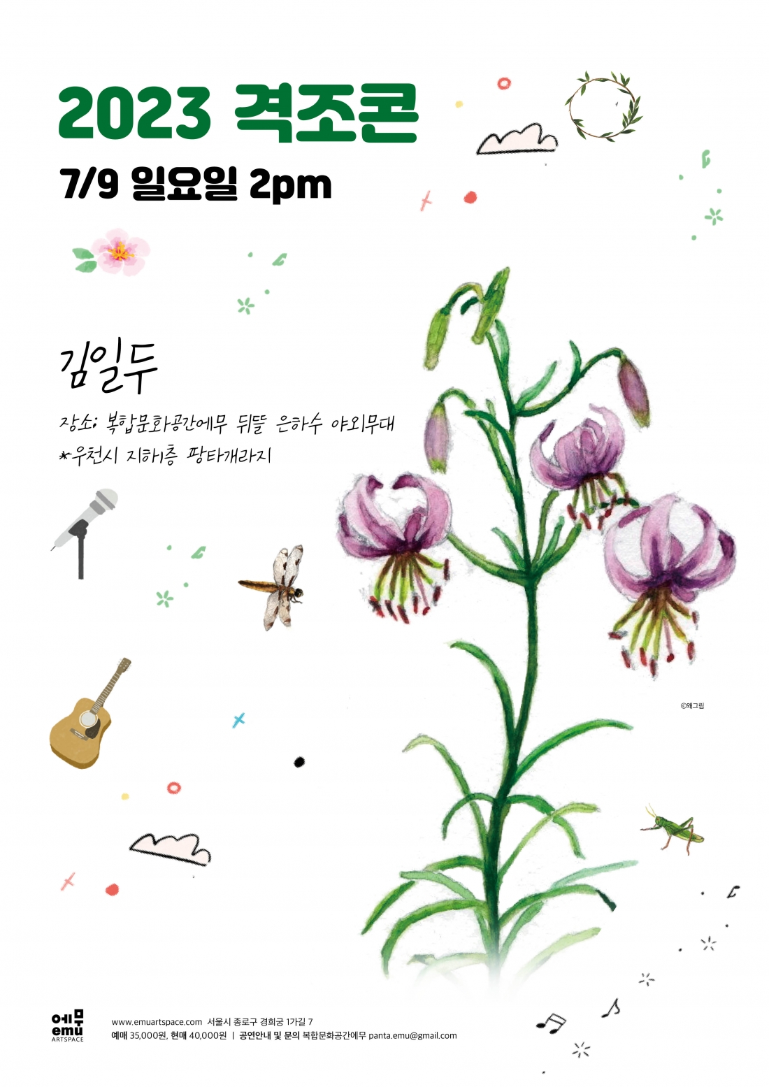 격조하지만 격조있게, 거리두기 콘서트 김일두의 감성 넘치고 곱고 맑은 영혼의 공연을 7월 첫 격조콘 무대에서 만날 수 있습니다. 격조(떨어져 있어 서로 어울리지 못함) 격조(사람의 품격과 취향, 격식과 운치에 어울리는 가락) 격조콘은 감염병 시대에도 음악가와 팬들이 직접 대면해서 교감할 수 있는 방안을 고민하며 기획한 공연입니다. '복합문화공간에무'에서 진행되는 이 만남이 꾸준히 지속될 수 있도록 관심과 응원을 부탁드립니다.