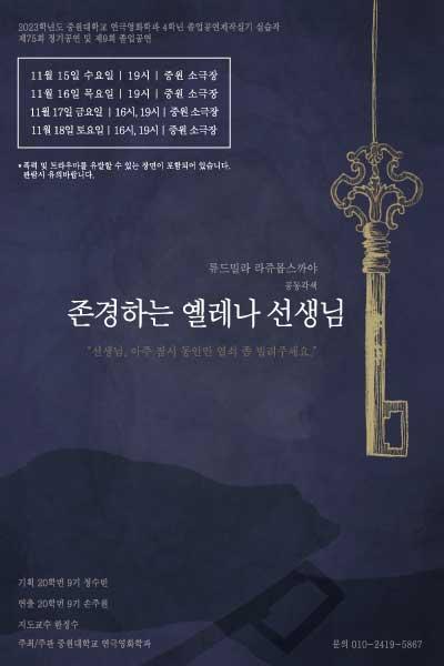 안녕하십니까 2023학년도 중원대학교 연극영화학과 4학년 졸업공연제작실기 실습작 및 제75회 정기공연, 제9회 졸업공연 류드밀라 라쥬몹스까야 作 공동각색 입니다! 교권에 관한 문제와 사건들이 많아지는 요즘, 학생들과 선생님들 모두가 안전하고 서로를 존중하는 학교의 모습을 바라며 이라는 작품을 준비했습니다. 성적을 위조하기 위해 선생님으로부터 시험지 보관소 열쇠를 얻기 위해 선생님을 방문한 학생들이 벌이는 회유와 협박, 끝까지 열쇠를 지키며 학생들에게 올바른 사상을 심어주고자 하는 선생님 간의 갈등은 점점 더 깊어가기만 합니다. 우리 공연을 보시고 학교라는 공간과 학생과 선생님 사이의 관계를 다시 한 번 생각해주시길 바라며, 우리 공연을 보러와주신 모든 관객 여러분들께 진심으로 감사드립니다. 지난 4년간, 모두가 함께 울고 웃고 시간을 보내며 지금까지 배워온 교수님들의 가르침을 적용해보며 열심히 준비했습니다. 졸업 공연을 끝으로 우리 9회 졸업생들은 학교를 떠나지만, 후배들과 먼 훗날 누군가의 아들, 딸, 조카들이 학교에 다닐 생각을 해보니, 학교라는 공간은 언제나 곁에 있게 되는 것 같습니다. 지금까지 학교에서의 모든 순간이 추억이고 배움이고 경험이었던만큼 앞으로의 학생들에게도 그렇기를 바랍니다.