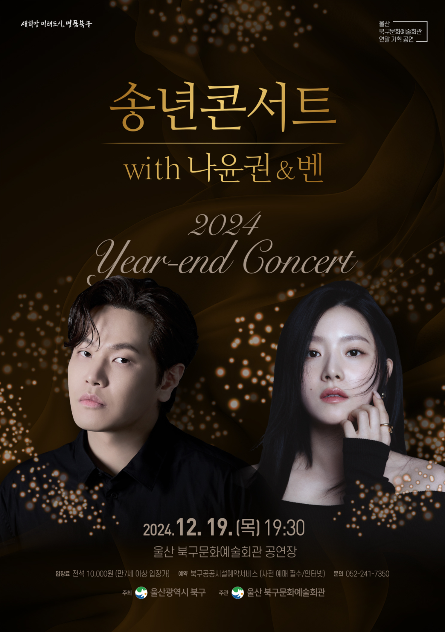 북구문화예술회관 2024 송년콘서트 북구문화예술회관은 12월 송년을 맞이하여 가창력과 인지도를 겸비한 '벤', '나윤권'을 초청하여 지역주민들의 다양하고 품격 있는 문화생활을 제공하고자 기획되었습니다. 이번 송년콘서트의 고품격 공연을 통해 추워지는 날씨를 잊을만큼 몸과 마음이 따뜻해지는 낭만 가득한 하루를 보내보시길 바랍니다.
