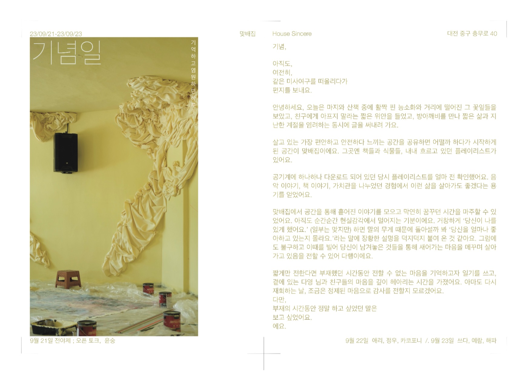 House Sincere 맞배집 오픈공연 기념일, 기억하고 염원했던 하루 대흥동 맞배집이 대사동으로 이사해 House Sincere, 맞배집으로 새로 오픈합니다. 부재하던 시간에 보고 싶었던 얼굴들, 마음들을 맞이하는 시간을 마련했어요. 많이 찾아와주시고 새로운 시작을 함께 만들어주세요.