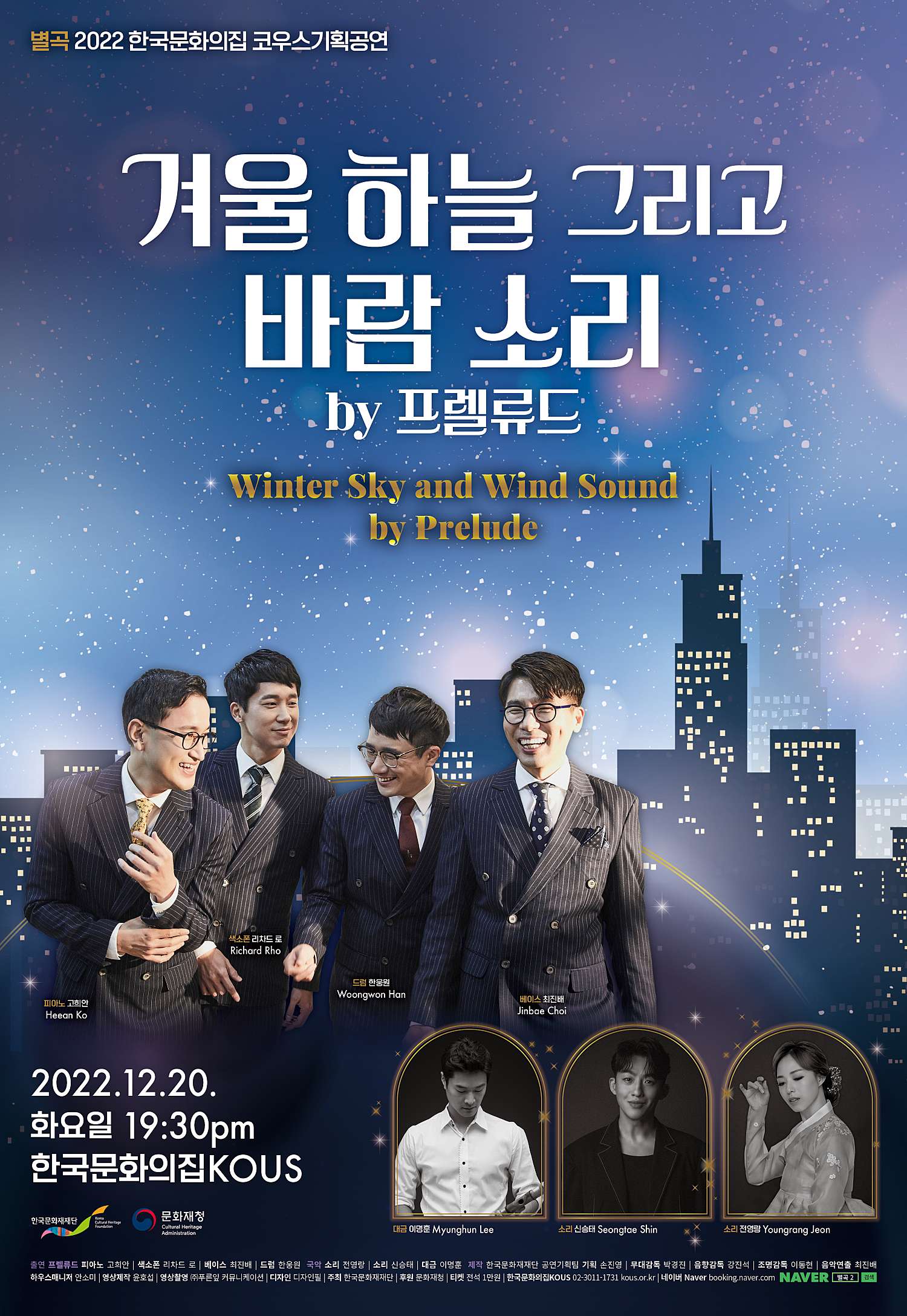 별곡 別曲 나누지 않으니 다르지 않은 별별別別 가락들의 향연 한국문화재재단 기획 시리즈 은 동서양의 음악이 만들어낸 장르의 벽을 허물어 우리의 전통음악을 새롭게 즐기는 방법을 제시합니다. 우리나라의 계절 겨울은 농한기 즉, 농사일이 바쁜 철인 농번기가 끝나서 한가한 시절이었다. 그래서 이때 다른 겸업이나 객지벌이도 많았으며 이때 음악에 재능이 있는 이들이 음악을 하며 놀기도 하고 그것을 보러 사람들이 보러오면서 공연이 이루어졌다. 농한기의 추운 겨울은 음악에 더 집중할수 있는 시기였으며 이때 우리 한국의 음악은 더 갈고닦여 졌었다 . 이번 공연 [겨울 하늘 그리고 바람 소리]는 재즈 밴드 프렐류드와 대금 이명훈, 경기소리꾼 전영랑, 신승태가 만나서 서로의 음악을 주고 받으며 갈고닦은 음악으로 현재와 과거의 겨울 이야기를 만들었다. 특히 색소폰과 대금, 소리는 모두 사람의 입을 통해 나오는 바람으로 연주되어지기에 다양한 바람 소리의 대비와 조화를 느낄수 있게 연출하였다. 농한기 그 시절 음악 재능인들이 모여서 음악을 발전 시키고 사람들에게 기쁨을 주었던 것처럼 이번 [겨울 하늘 그리고 바람 소리]의 공연도 많은 사람들에게 기쁨을 주고 새로운 음악 발전에 기여했으면 한다.