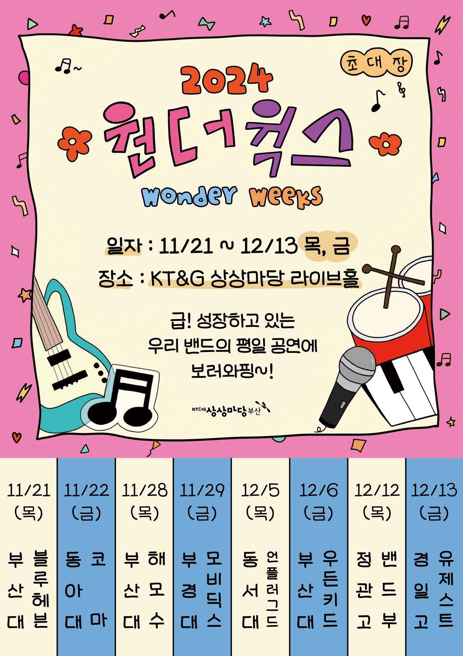KT&G 상상마당 부산과 부산대 블루헤븐이 함께하는 밴드 동아리 평일 활성화 공연 프로그램 입니다. 는 '영아 시기에 급격한 성장을 하는 성장 급등기' 와 'Wonder (궁금한, 경이로운) + Weeks (주간)' 라는 2가지 의미를 통해 내외적으로 성장하며 미래를 향해 나아가는 학생들의 경이로운 꿈을 응원하는 평일 공연 브랜드 입니다. 부제 : The Blue Universe 밴드 소개 - 블루헤븐 블루헤븐은 부산대학교 밴드 동아리들 중 가장 오래된 52년의 유구한 역사와 전통을 가진 동아리로, .락 음악을 위주로 다양한 장르의 음악을 연주합니다. 팔색조처럼 다채로운 매력으로 여러분들에게 재미와 감동을 선사하겠습니다.
