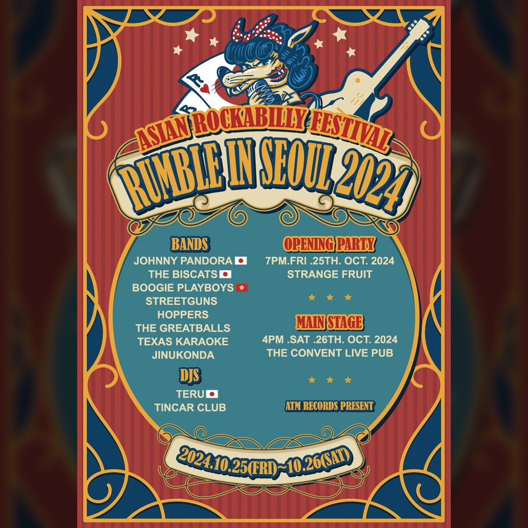 ASIAN ROCKABILLY FESTIVAL! 한국, 일본, 홍콩을 대표하는 로커빌리 뮤지션들이 만들어내는 이틀간의 로커빌리 페스티벌입니다! _ 이번 ASIAN ROCKABILLY FESTIVAL 에는 2.3억뷰의 5 Second of Summer 뮤직비디오 [Young Blood] 뮤비의 남, 여 주인공인 일본 로커빌리 밴드 가 모두 내한함은 물론, 홍콩 유일의 로커빌리 밴드 가 한국을 찾습니다. 한국의 로커빌리, 로큰롤, 컨츄리 밴드들도 모두 이번 [럼블인서울2024]에 집결합니다.