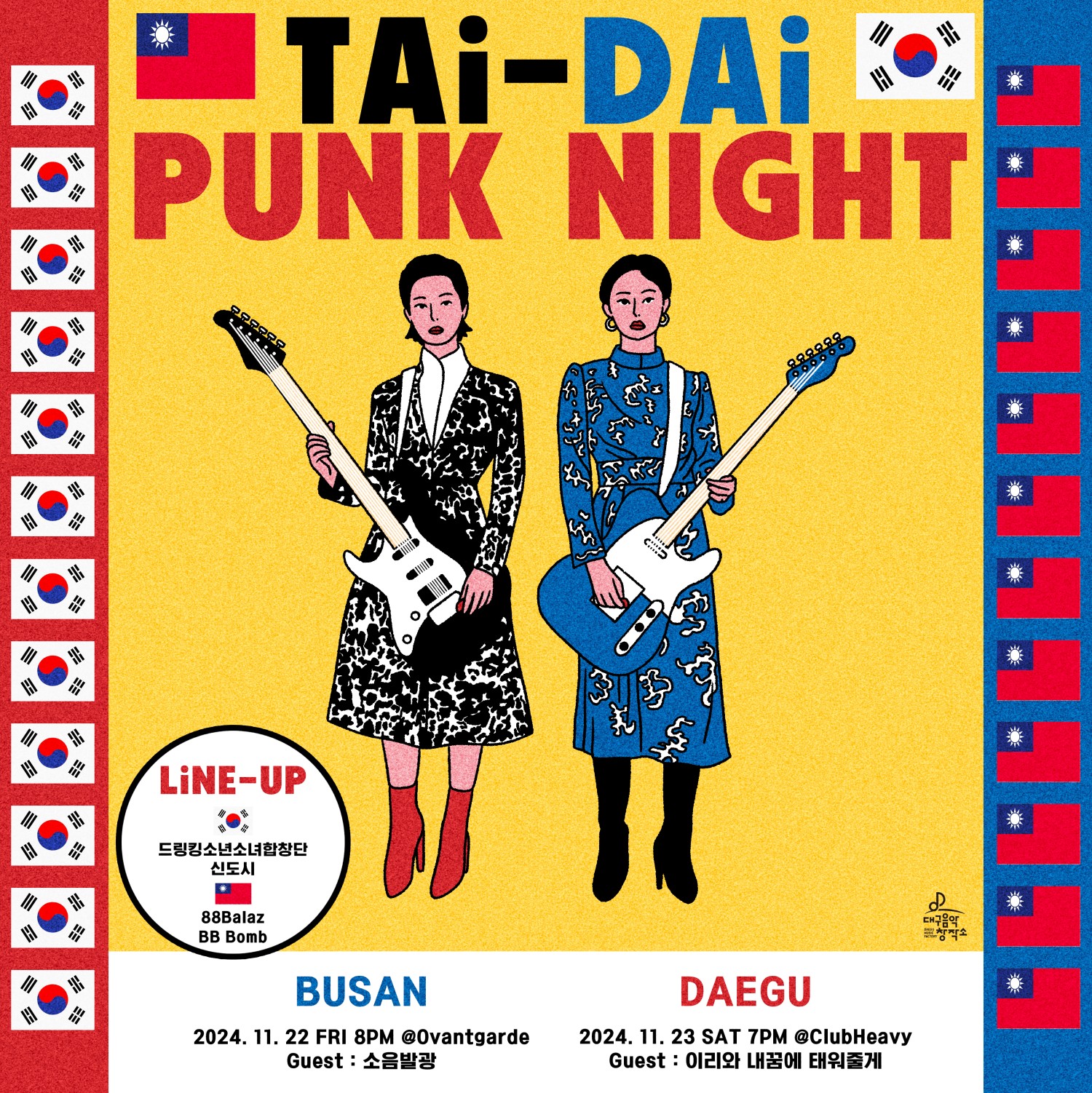 국경을 넘어 펑크에 대한 애정으로 모인4팀이 부산-대구 미니투어를 진행합니다. 타이베이와 대구의 펑크의 진수를 보고싶은 당신! 뜨거운 펑크의 밤으로 초대합니다! -출연팀- KR 드링킹소년소녀합창단@drinking_boys_and_girls_choir KR 신도시 @band_sindosi TW 88 Balaz @88balaz TW BB Bomb @bbbombband KR 이내꿈 @band_daydreamers_official (only Daegu)